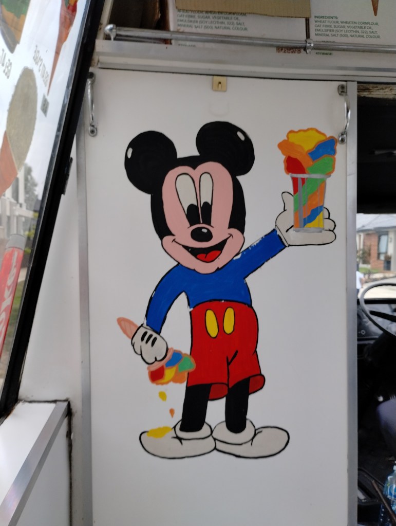 I like off-model cartoon characters, and the undisputed King of these Copyrighted Characters is The Mouse himself. He’s everywhere, although, primarily flea markets, carnivals and, of course, ice-cream trucks. Pretty much anywhere that Disney can’t touch the people using his image. Which I love for some reason. Never drilled into it. Let’s try now. It could be the hopeful air about them. That someone somewhere did their best, and this is what they came up with, and that was all that was needed. It says a lot about the nature of art and how we interpret it, both as makers and viewers. It could be the novelty of seeing someone else’s take on something you know so well. That certainly has to hold a particular fascination.